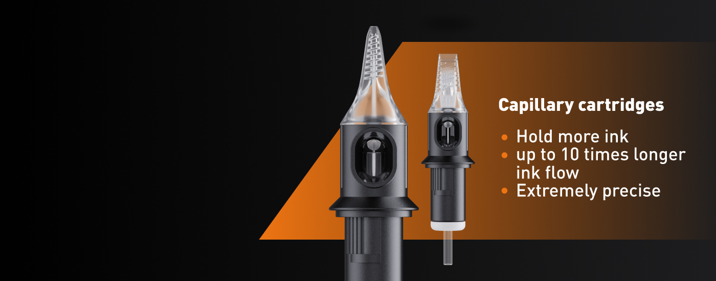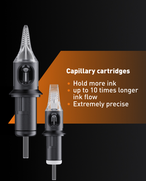 Das Geheimnis unserer Capillary Cartridges ist die revolutionäre Kapillare mit einem Reservoir in der Spitze des Cartridges. Sie fasst viel mehr Tinte als herkömmliche Tattoo-Cartridges, was zu einem bis zu 10-mal längeren Tintenfluss führt, bevor die Tattoo-Nadeln erneut in Tinte getaucht werden müssen. Man muss die Cartridge-Spitze nur etwas länger eintauchen als sonst. Das Mischen der Farben in dem Cartridge und das Ausspülen mit Wasser funktionieren weiterhin einwandfrei.
