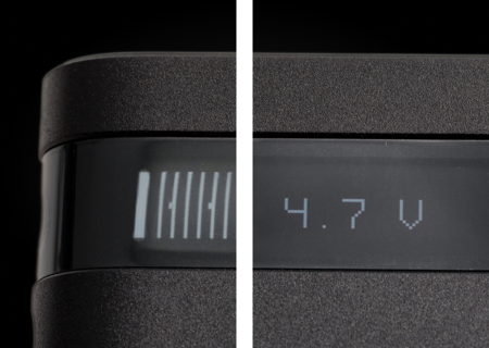 - Una pantalla que muestra el voltaje (4,7 V - 12,5 V en intervalos de 0,1 V) o una pantalla con gráfico de barras (30 niveles, aprox. 0,26 V por nivel)