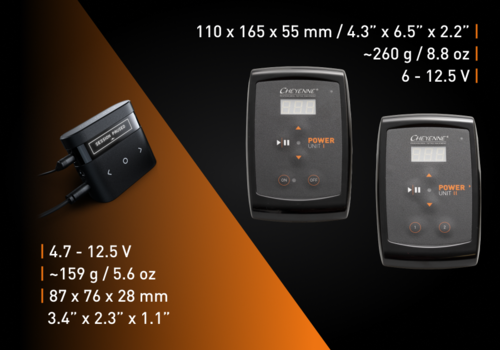 Aquí es donde terminan las similitudes de las fuentes de alimentación de Cheyenne y donde empiezan las diferencias. Con un tamaño razonable, las dimensiones de la POWER UNIT IV son de 87 mm x 76 mm x 28 mm (3,4" x 2,3" x 1,1") y es considerablemente más pequeña que sus equivalentes, cuyo tamaño es de 110 mm x 165 mm x 55 mm (4,3" x 6,5" x 2,2"). La POWER UNIT IV también es mucho más ligera, con solo 159 g (5,6 oz) en comparación con las POWER UNIT I y II, que pesan aprox. 250 g (8,8 oz). Su ligereza y el tamaño compacto la convierte en una fuente de alimentación excelente para los artistas del tatuaje que suelen viajar.